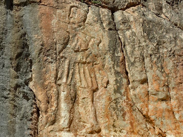 [cave79] הנוף עוצר נשימה, אולם ההפתעה הגדולה מחכה למטייל שטרח והגיע לכאן דווקא על קיר הסלע מספר מטרים מזרחית לפתח המערה. תבליט סלע של דמות אדם בגודל טבעי הנראה כחייל רומי. הדמות ללא כובע וזקן, לבושה בבגד קפלים כפי שמוכר מפסלים הלניסטיים. הראש והרגלים פונים לכוון אחד והגוף לחזית. יד אחת מורמת ונמחקה בחלקה, ואילו היד השניה כפופה ומתחת למרפקה נשק. לא בכדי מכונה הדמות "האיש שבקיר" והתעלומה האופפת אותה מתאימה למילות שיר משנות ה 50 "מי מכיר את האיש שבקיר".